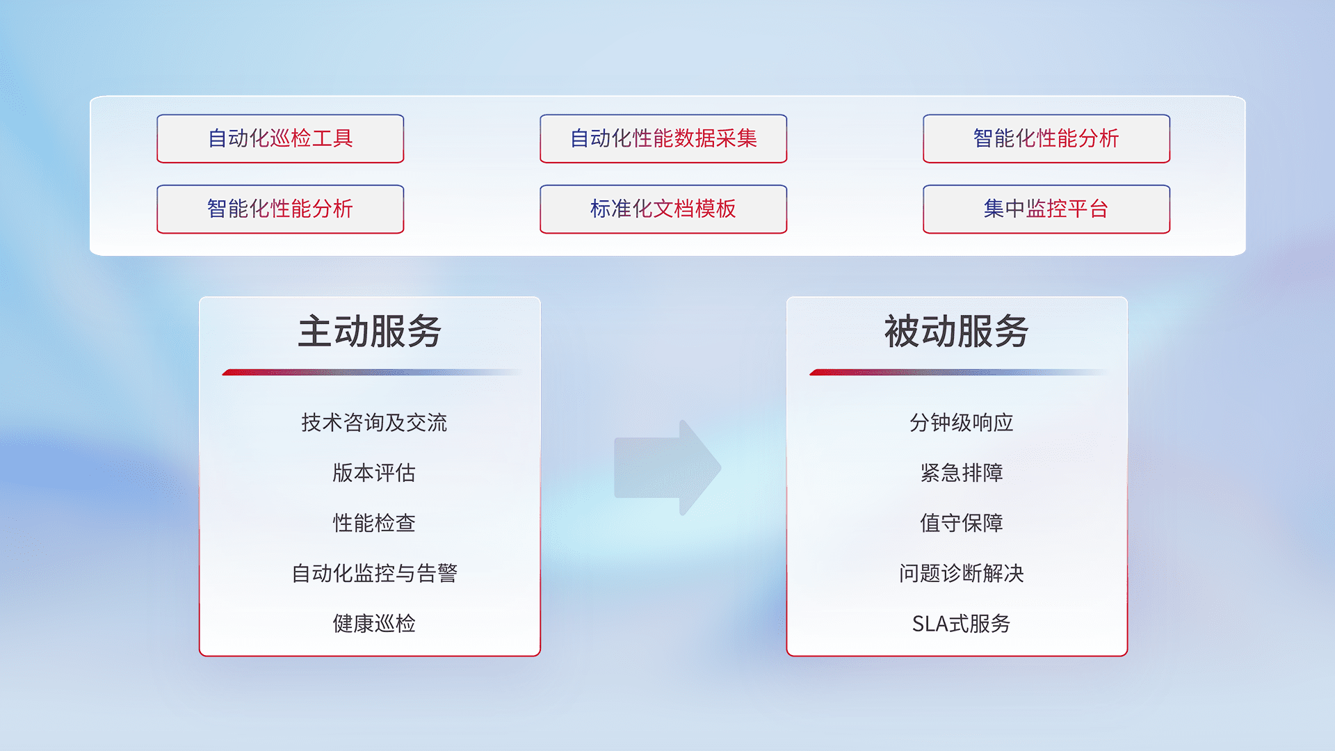 智能化工具和标准化文档,,,保障服务质量,,,提供主动服务(包含技术咨询、、、版本评估、、、、性能检查、、、、自动化监控与告警、、、、健康巡检)和被动服务包含(分钟级响应、、紧急排障、、、、值守保障、、、问题诊断解决、、、、SLA服务)。。。。
