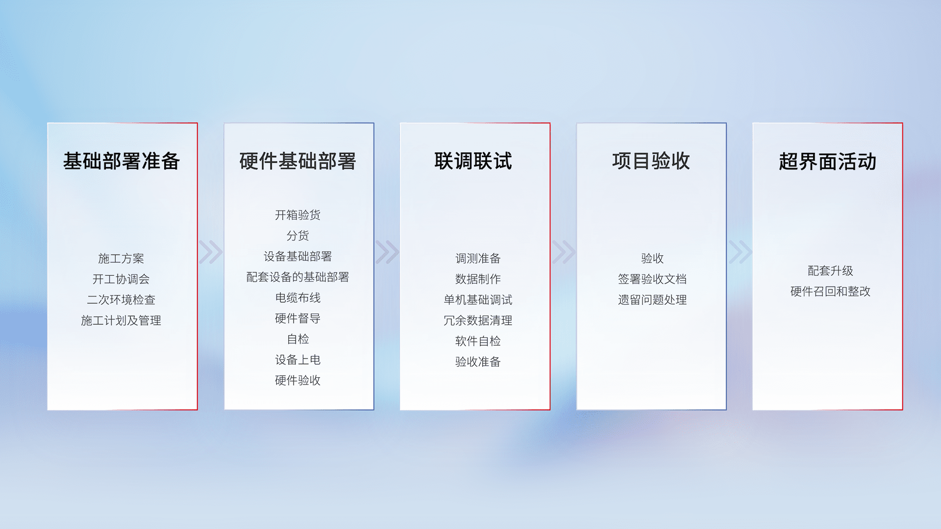 从基础部署准备、、、、硬件基础部署、、联调联试、、项目验收、、越界面活动的全过程可追溯,,保证施工质量和进度。。